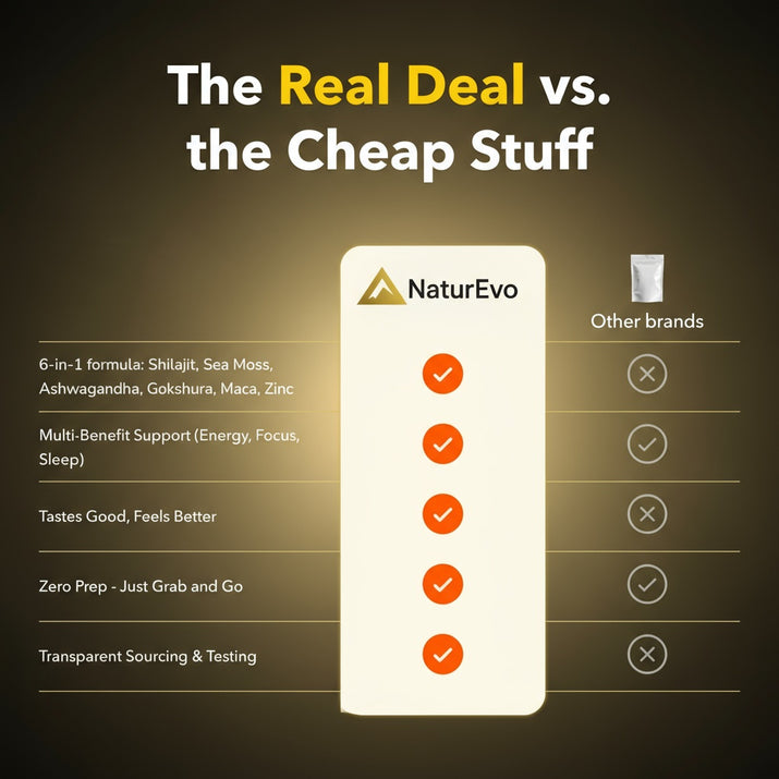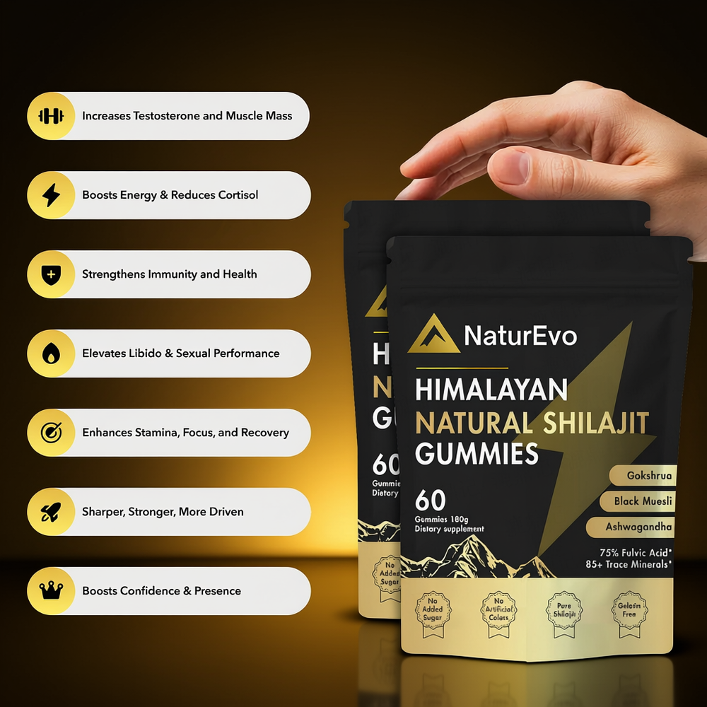 Each delicious NaturEvo™ gummy is packed with the ancient Himalayan powerhouse — pure Shilajit, blended with adaptogens and minerals that recharge your body and mind from the inside out.